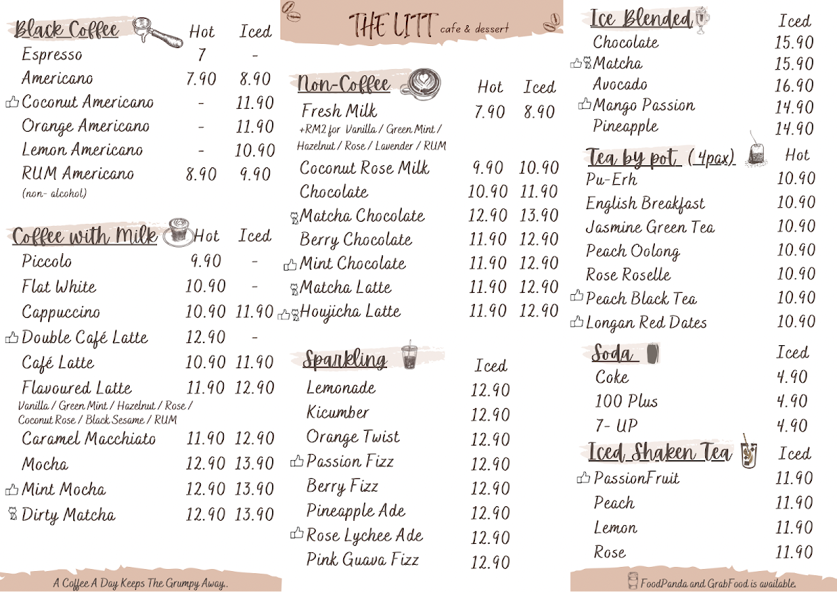 The menu at The Litt offers a range of options suitable for coffee breaks, light meals, and casual dining. It is organized into several key categories, including sparkling beverages, soft beverages, and waffles.